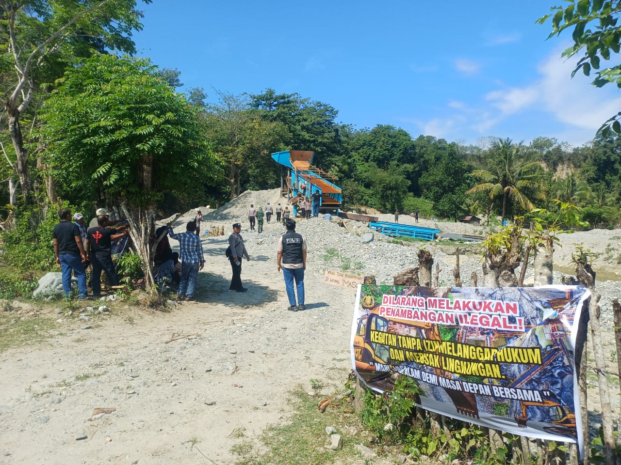 Spanduk yang dipasang di lokasi memuat imbauan “Stop Penambangan Ilegal” serta dasar hukum Pasal 158 Undang-Undang tentang Pertambangan Mineral dan Batubara.